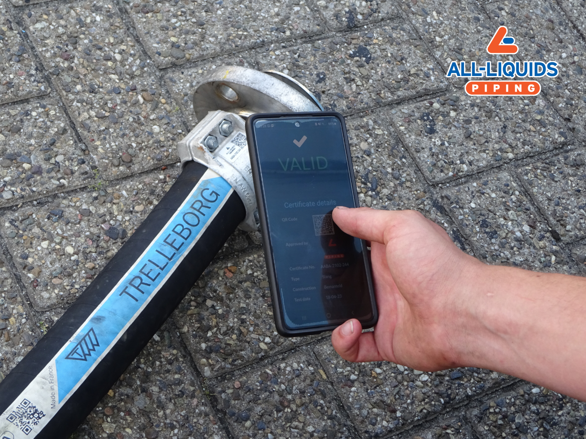 Het materiaal van All Liquids Piping is voorzien van unieke QR-codes waardoor het certificaat met bijbehorende technische informatie altijd op iedere locatie te bekijken is.